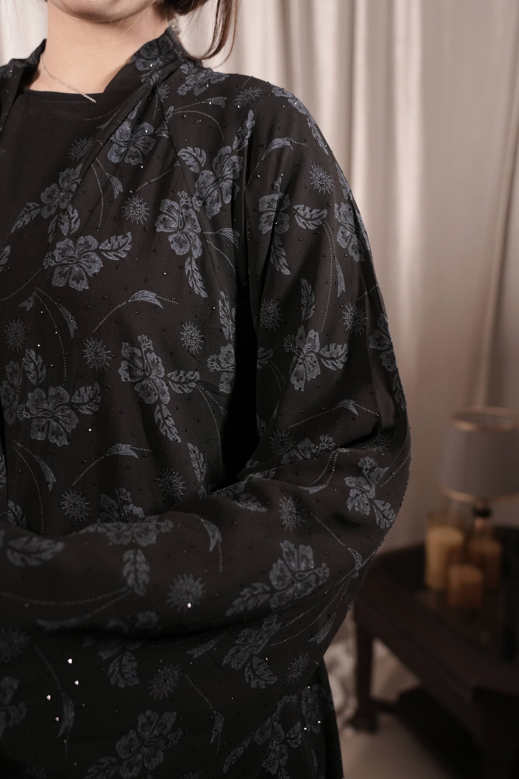 Elevate your modest wardrobe with this Black Organza Jacket-Style Beaded Abaya, designed to blend timeless elegance with modern sophistication. Crafted from lightweight sheer organza, this full-length abaya features an open-front jacket silhouette complemented by a detachable waist tie, allowing for a customizable and flattering fit.