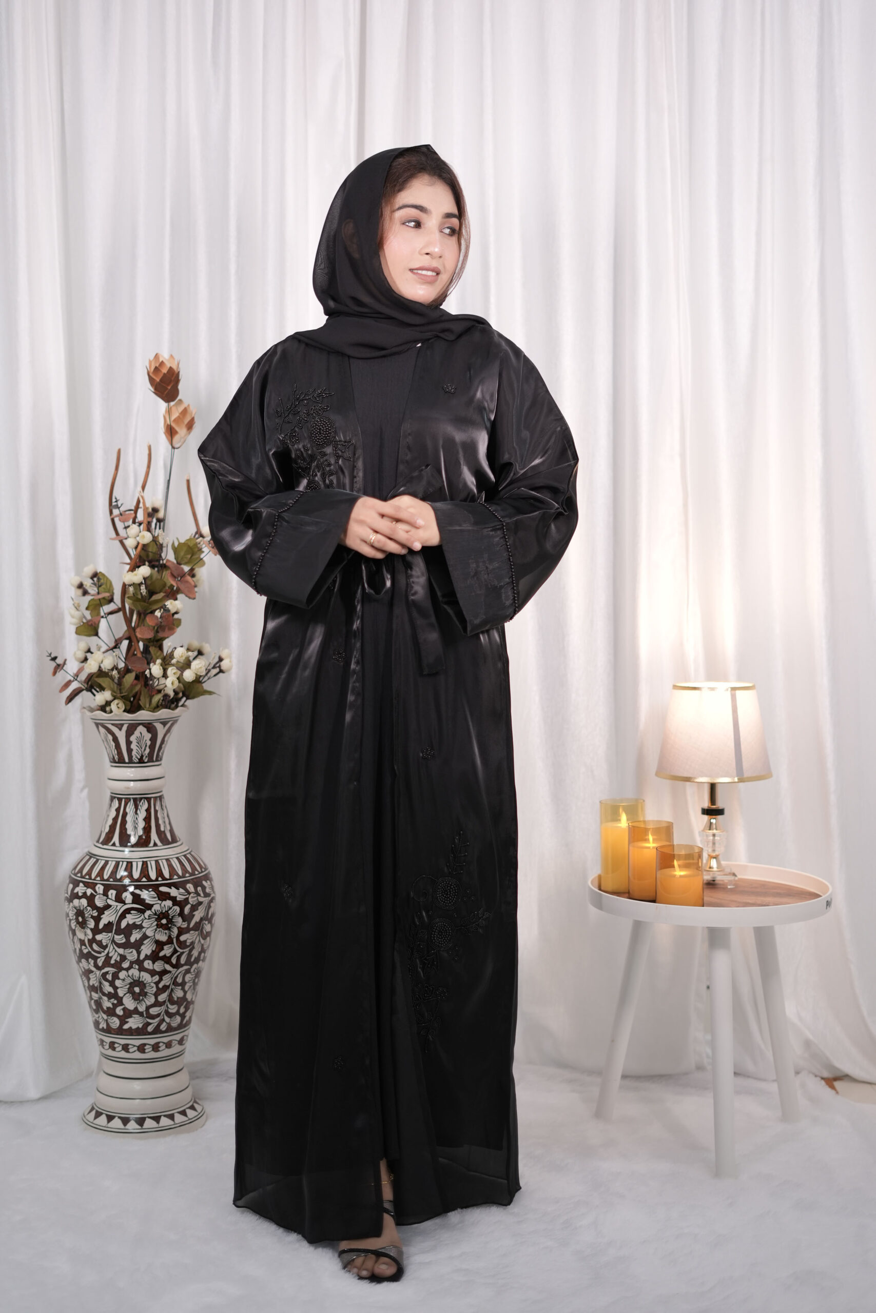 Refine your modest wardrobe with this Black Organza Jacket-Style Beaded Abaya, a graceful fusion of modern sophistication and timeless elegance. Tailored from luxurious sheer organza, it features an open-front jacket silhouette complemented by a detachable waist tie for an adjustable, flattering fit.