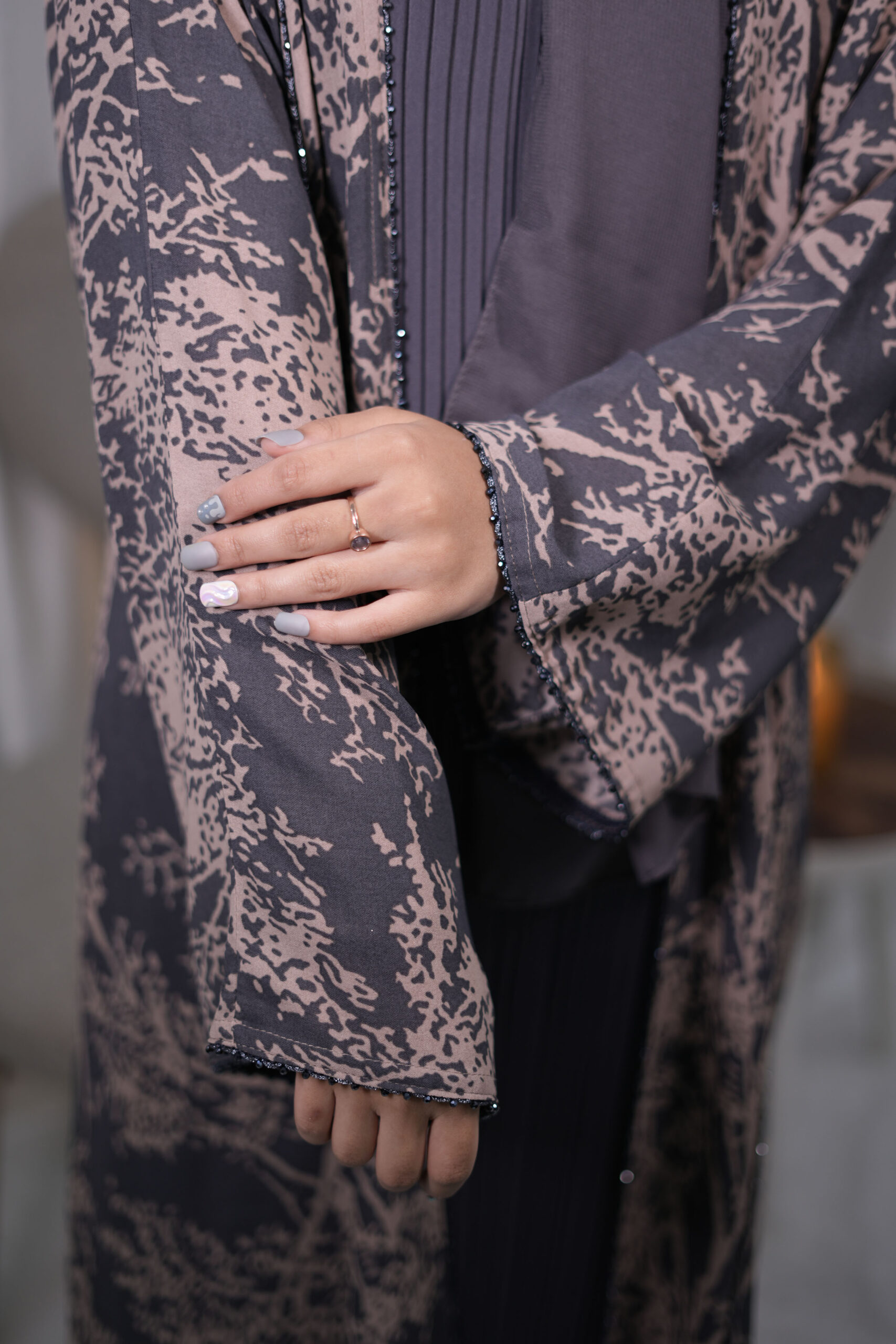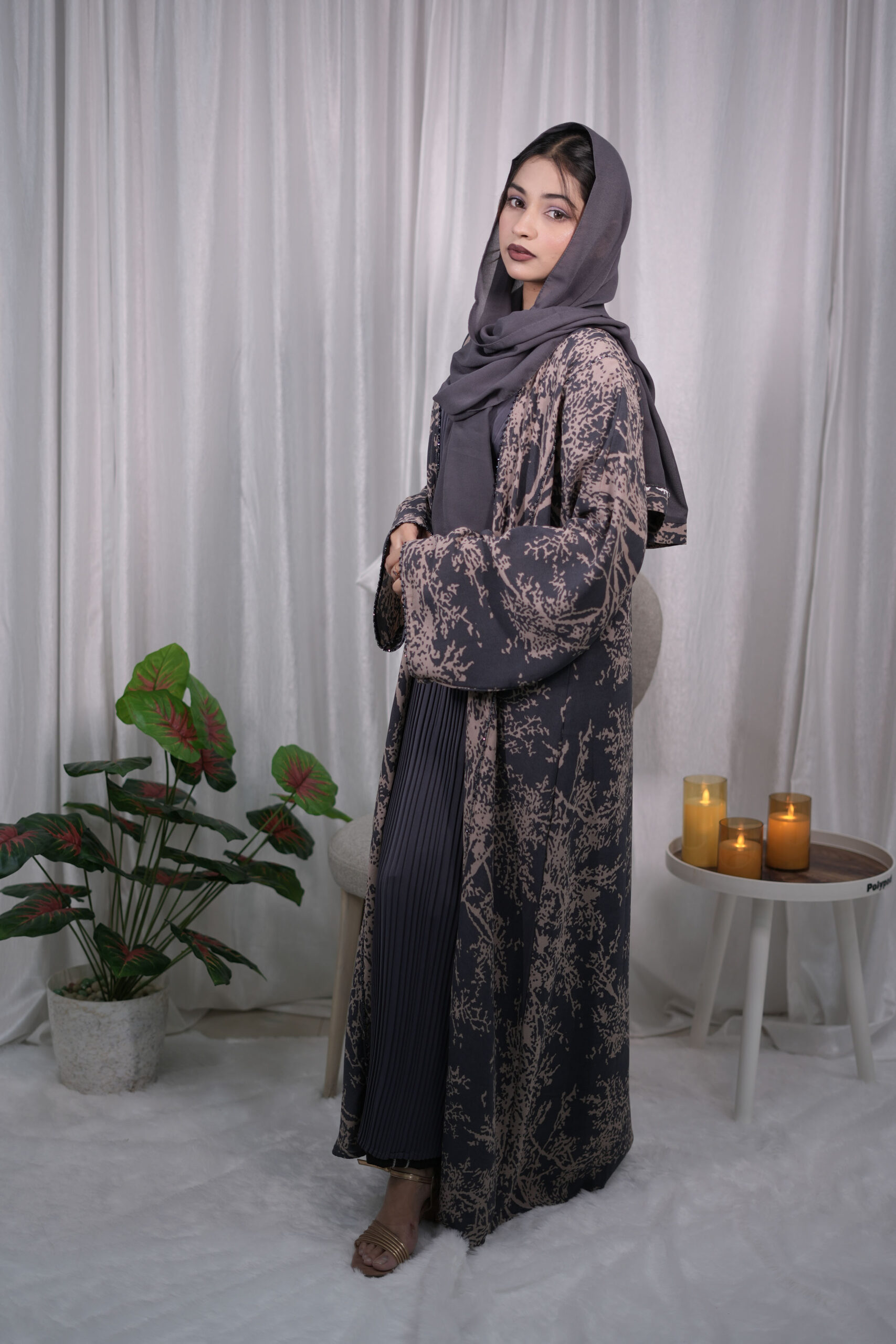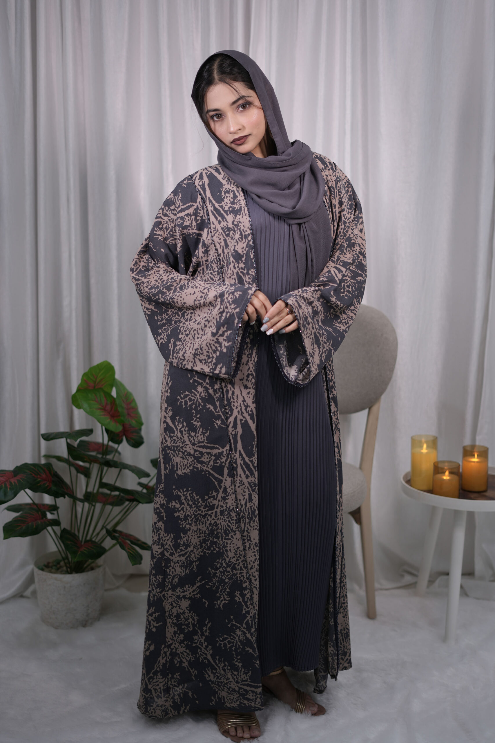 Graceful and contemporary, this Elegant Abaya with Beige Abstract Detailing combines modern styling with natural inspiration. Crafted from a soft, lightweight fabric, it drapes beautifully and allows effortless movement. The open-front design makes it perfect for layering, while wide sleeves enhance comfort and fluidity. Styled with a matching pleated inner dress in deep grey and a coordinating hijab, this ensemble transitions seamlessly from formal events to everyday elegance.