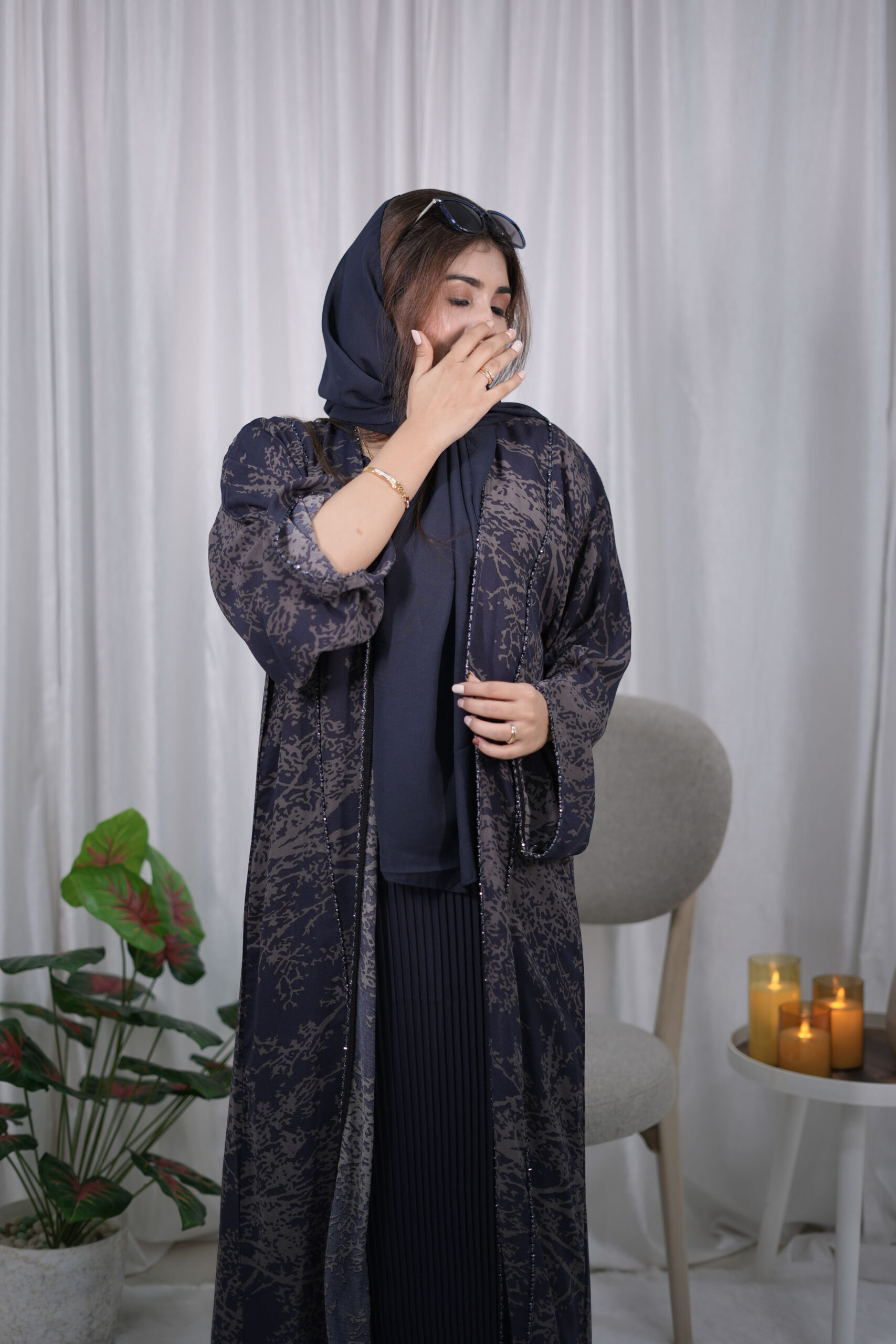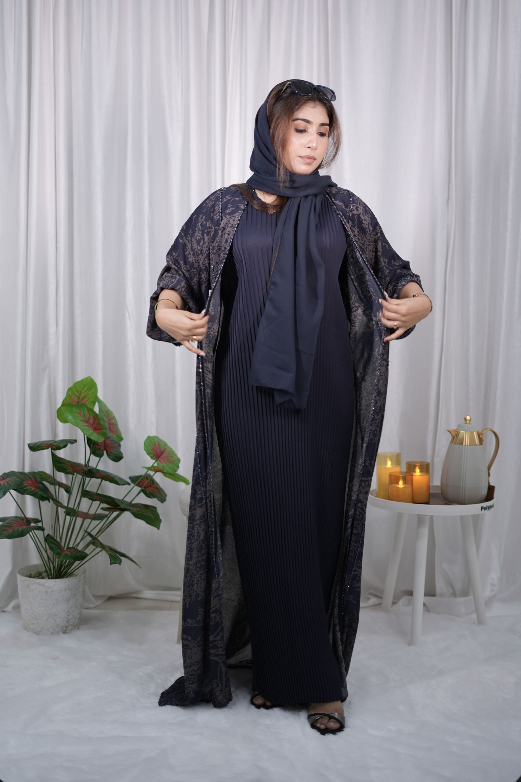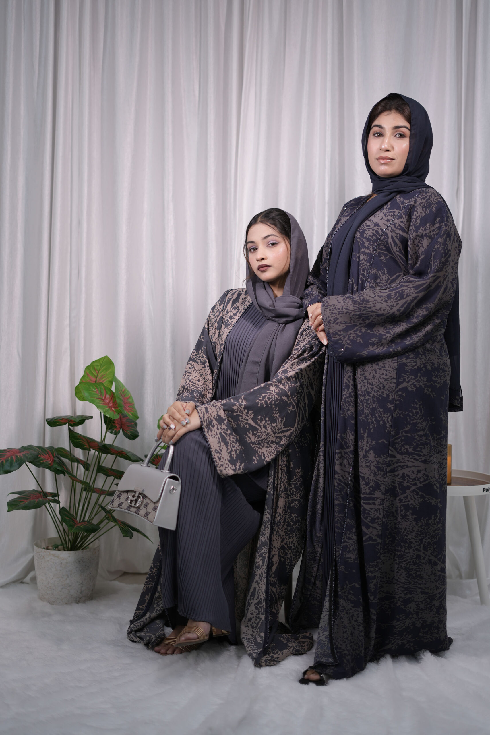 Graceful and contemporary, this Elegant Abaya with Beige Abstract Detailing combines modern styling with natural inspiration. Crafted from a soft, lightweight fabric, it drapes beautifully and allows effortless movement. The open-front design makes it perfect for layering, while wide sleeves enhance comfort and fluidity. Styled with a matching pleated inner dress in deep grey and a coordinating hijab, this ensemble transitions seamlessly from formal events to everyday elegance.