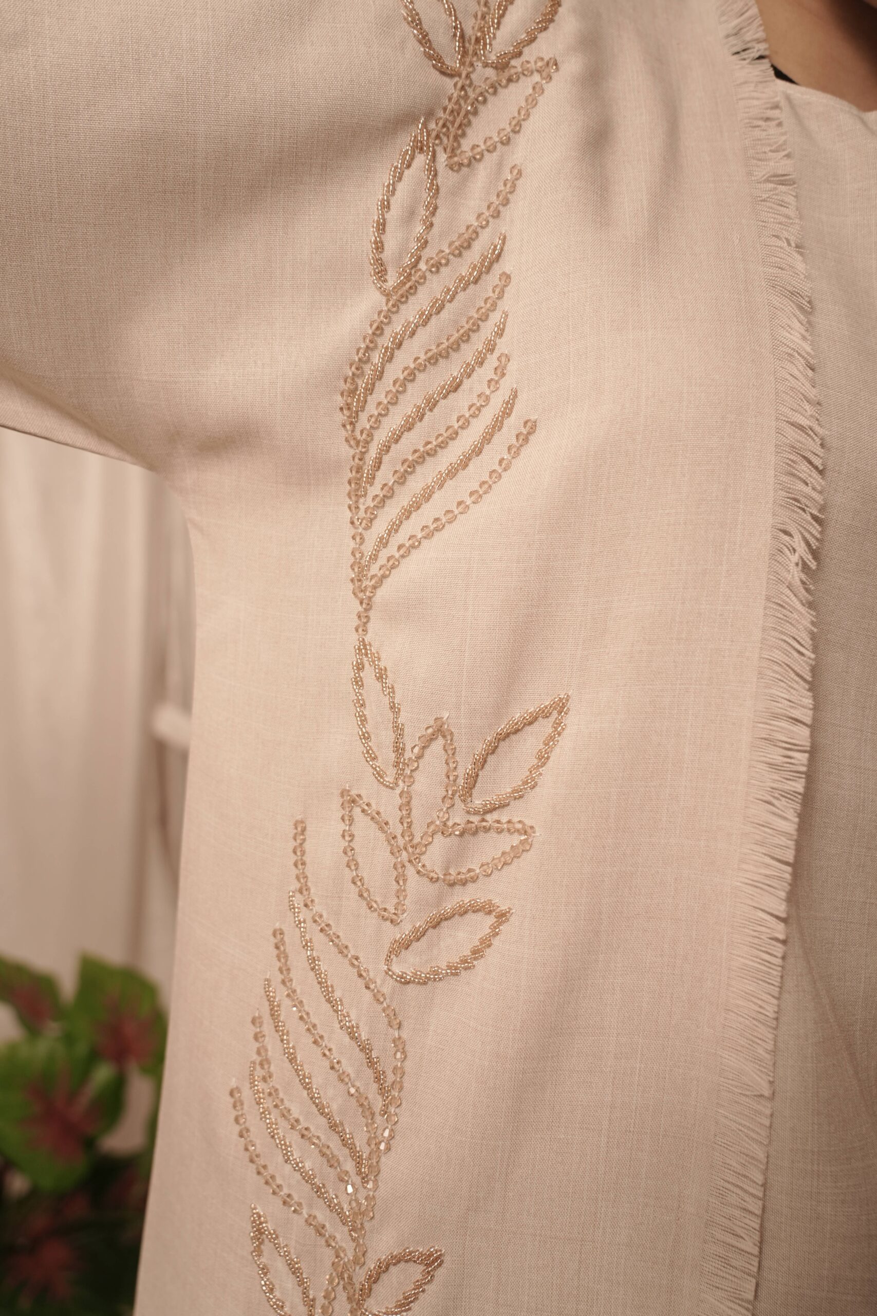 This beautifully crafted neutral-toned abaya reflects timeless elegance through its soft texture and delicate detailing. Designed with a flowing, full-length silhouette, it is made from lightweight fabric that drapes effortlessly, offering both comfort and graceful movement.Care Instructions