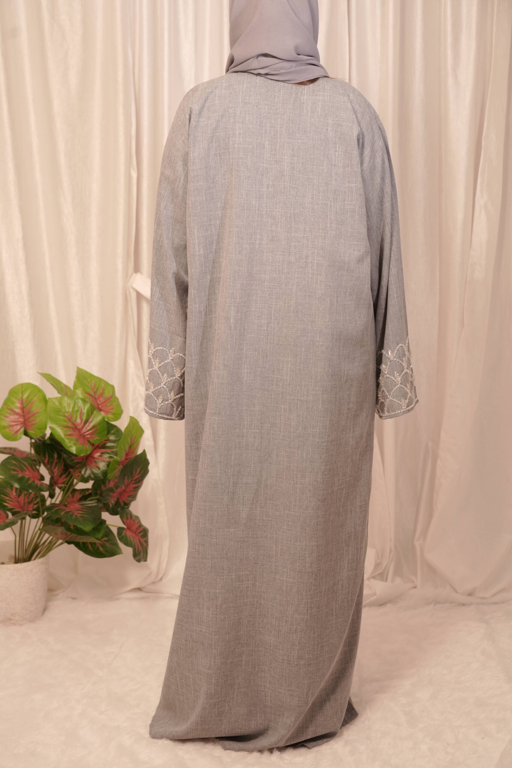 Elevate your wardrobe with this timeless grey ensemble, designed to embody effortless elegance and modern modesty. Crafted from a lightweight, breathable fabric, the piece drapes beautifully to create a soft, flowing silhouette that flatters while ensuring comfort throughout the day.